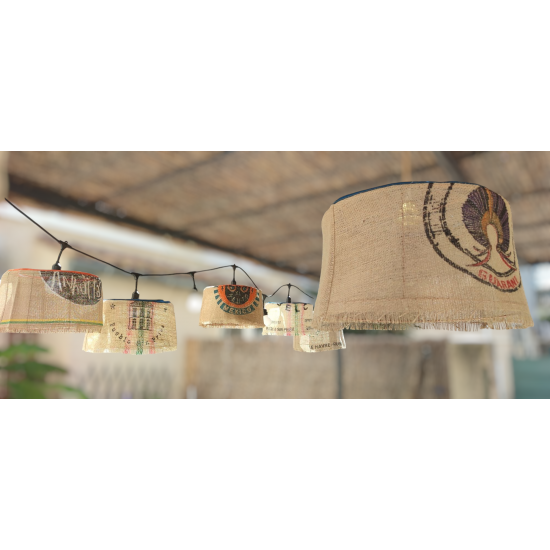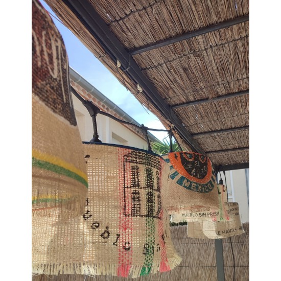 Suspensions en toile de sac de café. Nous les avons sélectionnés pour leurs motifs et couleurs. Ils ont été découpés et associés à une couleur. Chaque pièce est donc unique, le travail est long et les finitions sont parfaites.